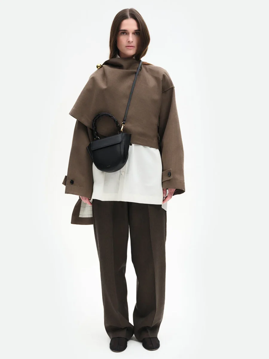 Sac Hortensia Mini signé Wandler confectionné en cuir d’agneau noir accompagné d’une hanse en bambou noir. Un sac de forme circulaire pouvant se porter à la main ou en bandoulière grâce à une sangle détachable.