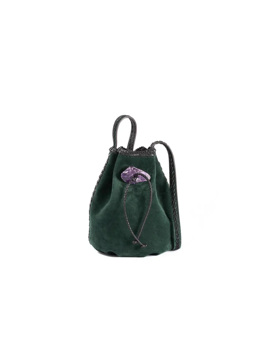 Nirmala suède green. Ce sac bourse est orné d’un cristal qui sert de fermeture. Il est accompagné d’une pochette intérieure et de lanières suffisamment longues pour pouvoir le porter à l’épaule ou en crossbody. Les cristaux peuvent varier d’un sac à l’autre.