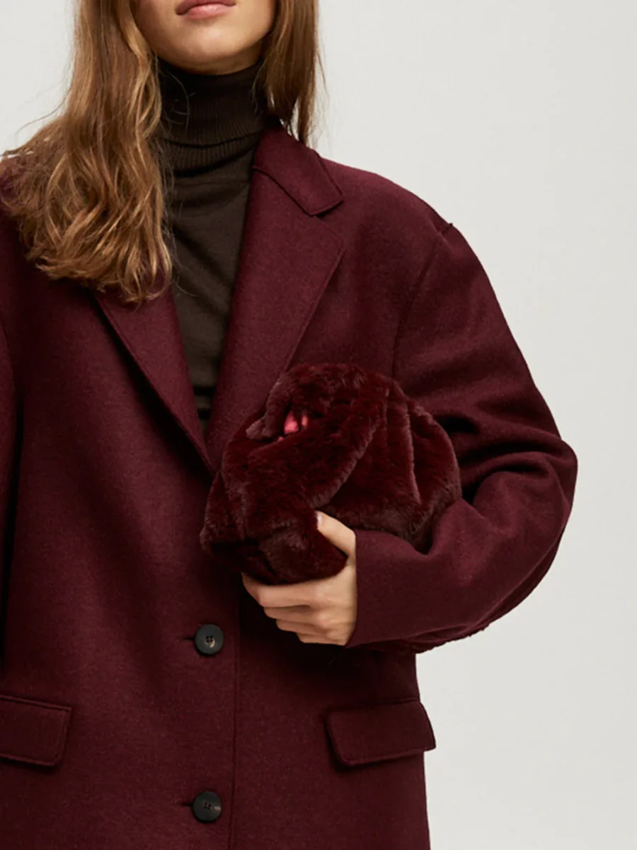 Sac Game Nita signé Maria La Rosa confectionné dans une fausse fourrure de couleur bordeaux. Une nouvelle interprétation de l’emblématique sac Game de la marque.