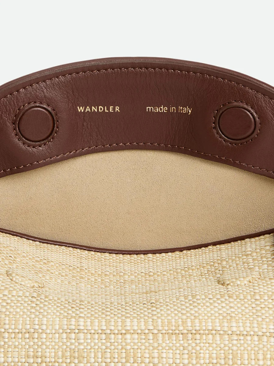 Sac Penelope Slouch signé Wandler confectionné en raphia naturel et aux bordures en cuir marron. Un sac pouvant se porter en bandoulière, à l’épaule ou à la main grâce à une sangle ajustable.