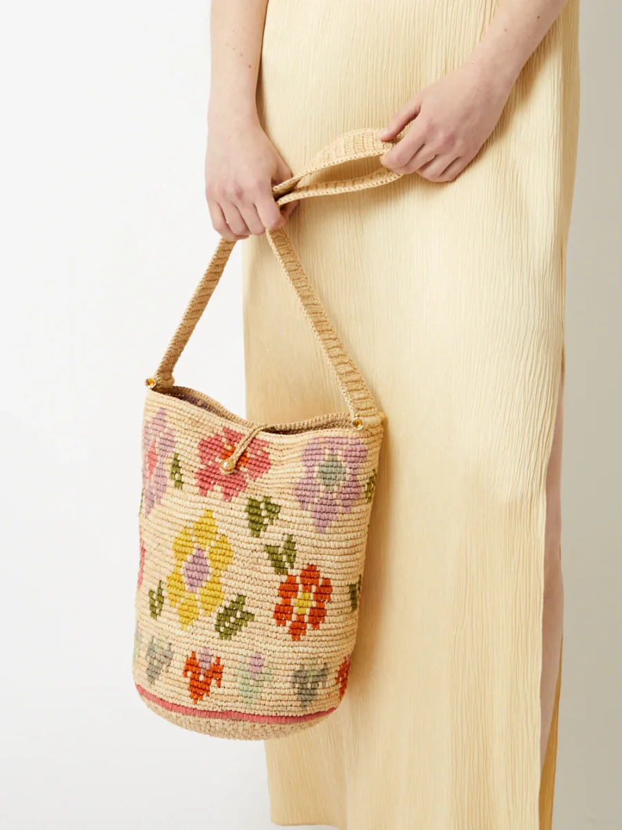 Le sac seau signé Gas Bijoux réalisé en raphia naturel teinté s’habille d’un nouvel imprimé floral et de barrettes ornées de pierres fines.