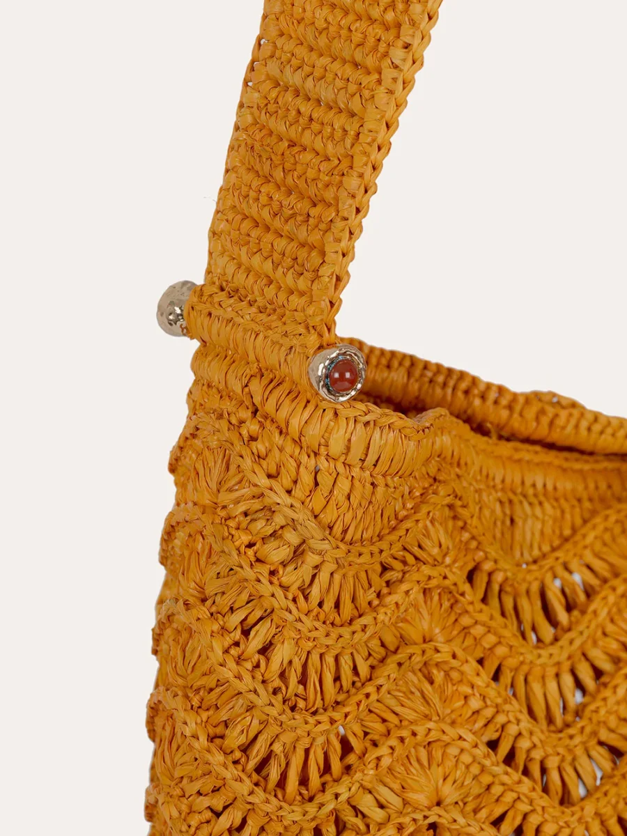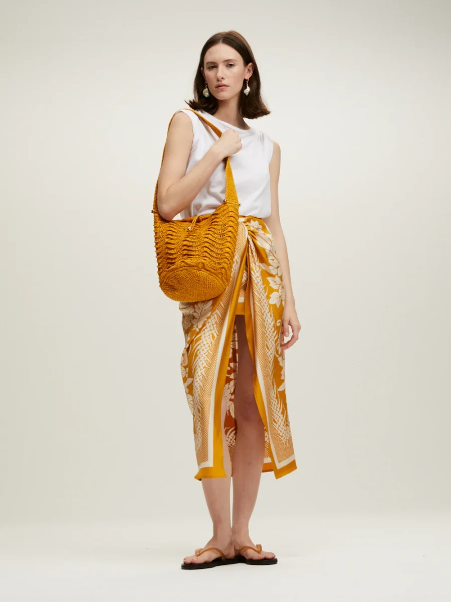 Sac Seau Les Palmiers signé Gas Bijoux confectionné en raphia de couleur jaune safran. Un sac seau confectionné de manière artisanale dans notre atelier à Madagascar.