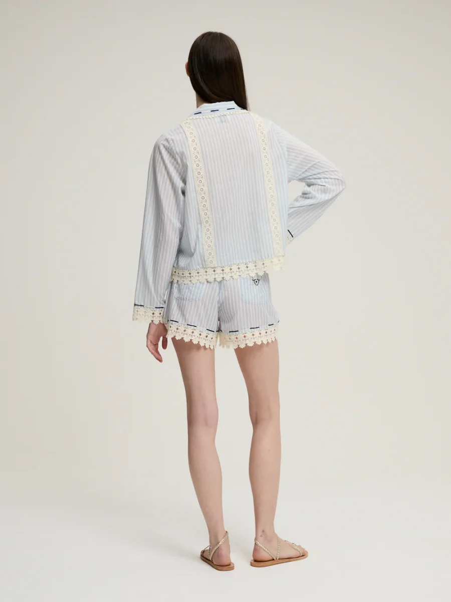 Short Gloria signé Monoki confectionné en coton bleu ciel aux rayures blanches, le tout décoré de dentelle ajourée. Un petit short à la taille élastique, accompagné de poches plaquées à l’arrière et brodées.
