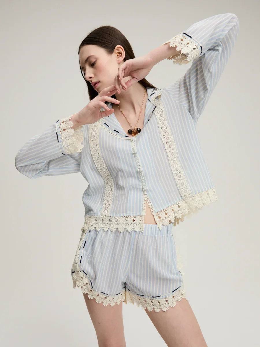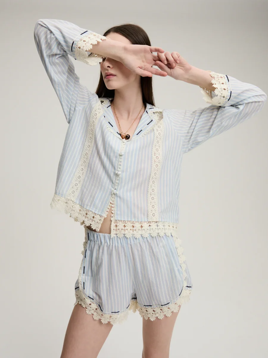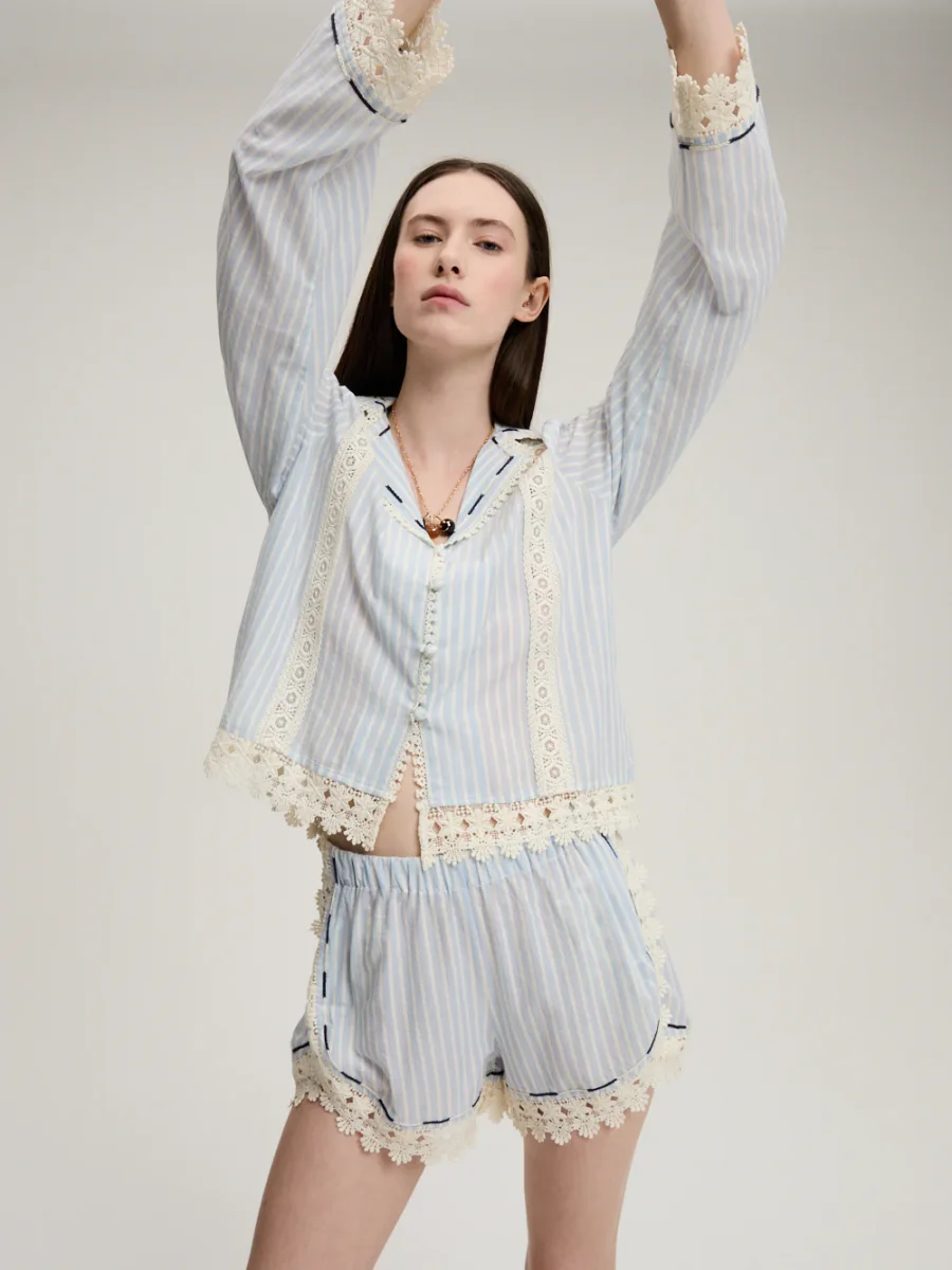 Short Gloria signé Monoki confectionné en coton bleu ciel aux rayures blanches, le tout décoré de dentelle ajourée. Un petit short à la taille élastique, accompagné de poches plaquées à l’arrière et brodées. – Le mannequin mesure 1m76 et porte une Taille Unique