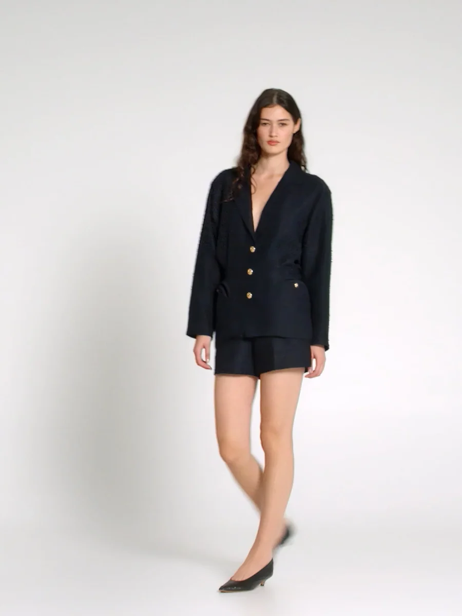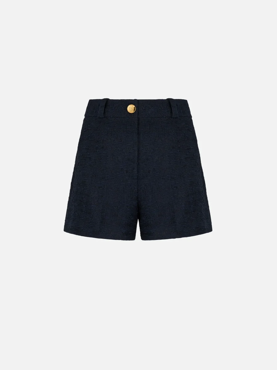 Short Teke Esence Navy signé Blazé Milano confectionné en coton bouclé bleu marine. Une short court à la taille haute, fermé par un zip et un bouton doré gravé de l’emblème de la marque.