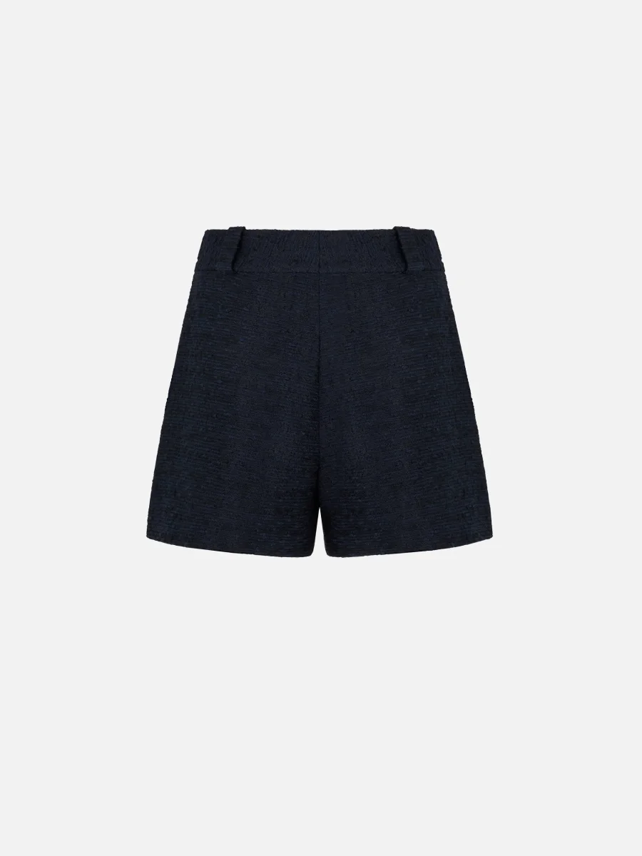 Short Teke Esence Navy signé Blazé Milano confectionné en coton bouclé bleu marine. Une short court à la taille haute, fermé par un zip et un bouton doré gravé de l’emblème de la marque. – Fabriqué en Italie – Passants de ceinture