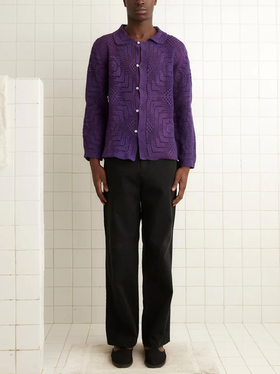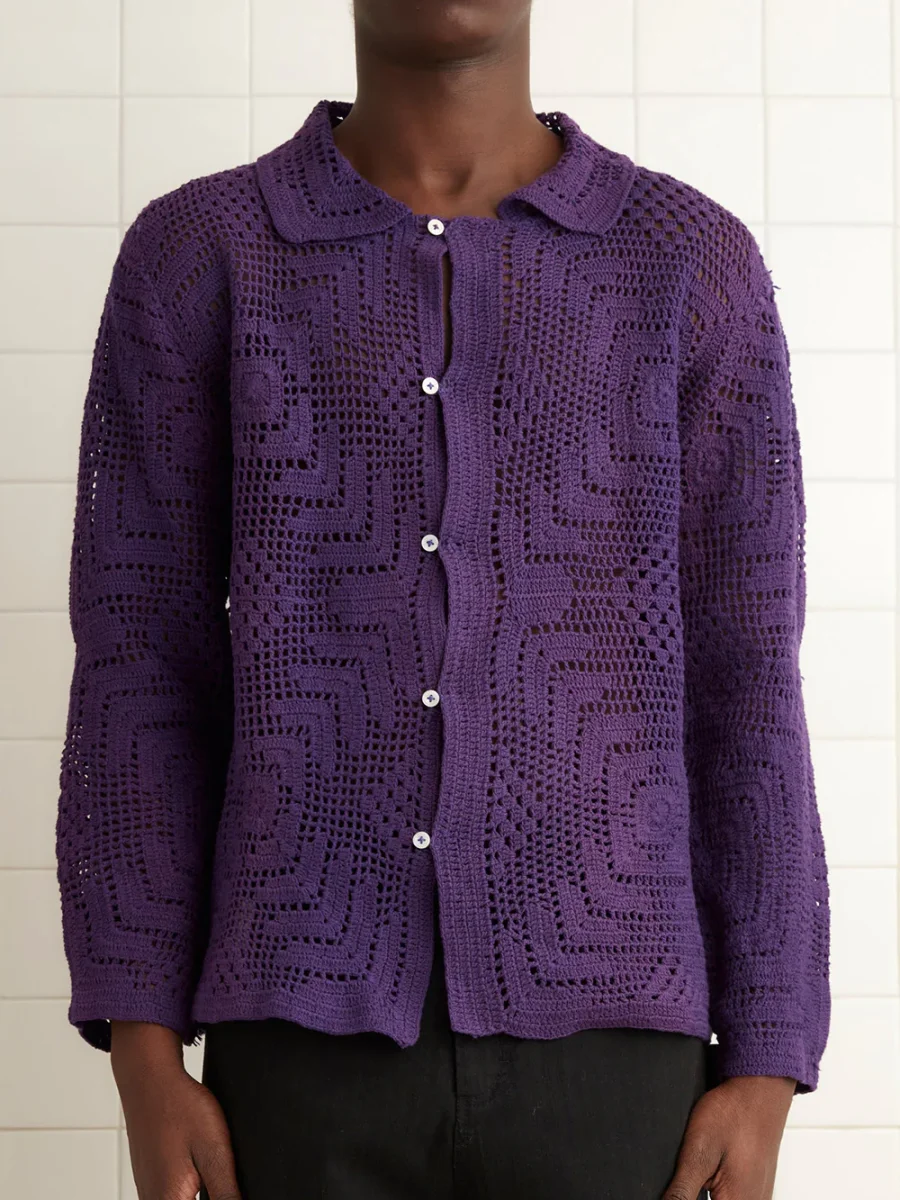 Surchemise en crochet signée Bode confectionnée en coton violet foncé. Le tissu utilisé pour la confection de cette chemise est inspiré des napperons des années 1930-1940.