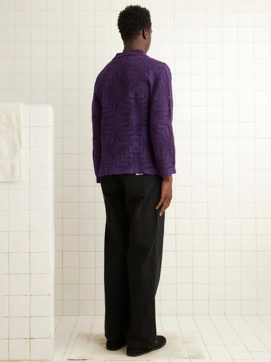 Surchemise en crochet signée Bode confectionnée en coton violet foncé. Le tissu utilisé pour la confection de cette chemise est inspiré des napperons des années 1930-1940. – Fabriquée en Inde – 100% Coton – Le mannequin mesure 1m82 et porte une taille M