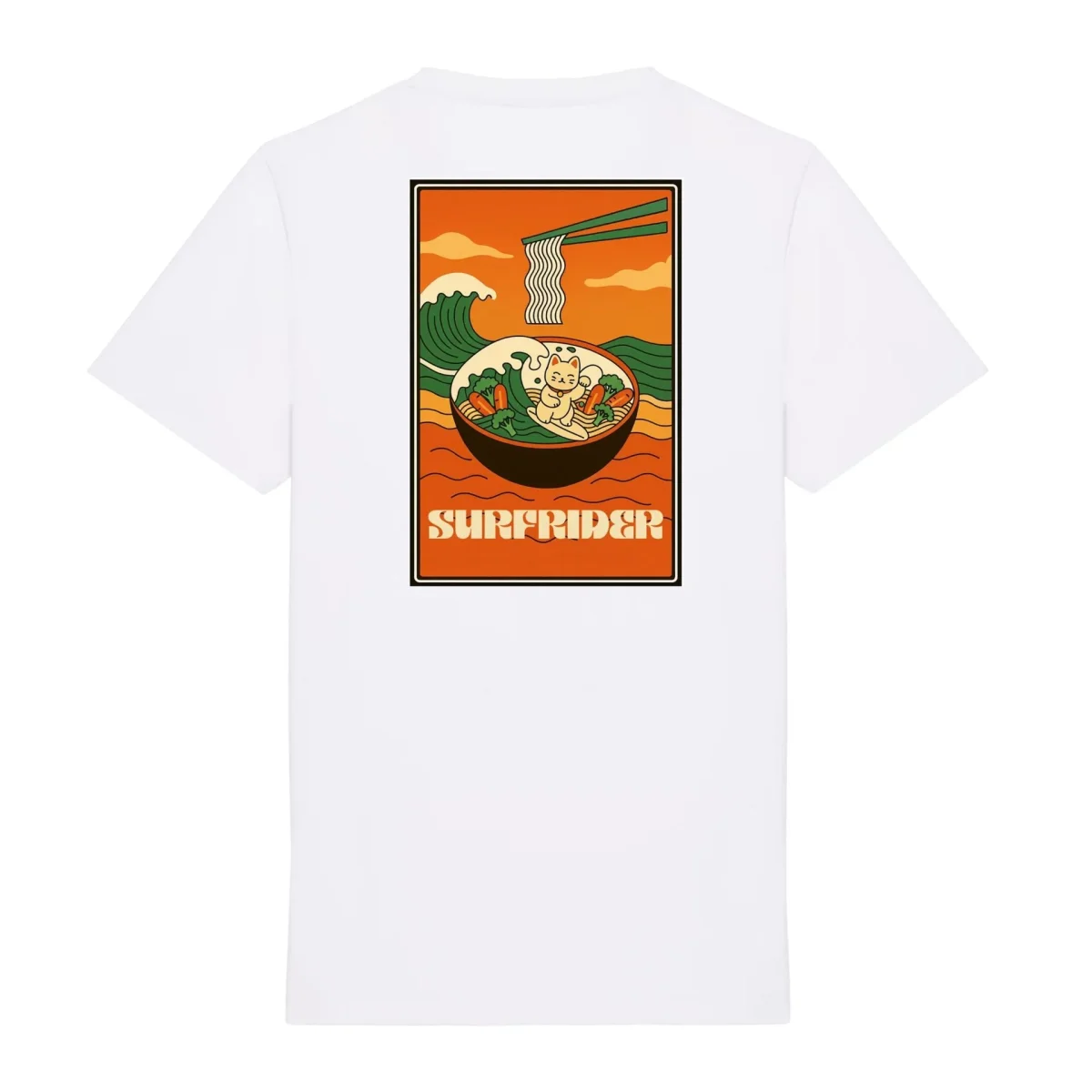 Avec son design original et plein de bonne humeur, ce t-shirt blanc célèbre la culture surf et la gourmandise, avec une touche asiatique. Un clin d’œil à l’esprit Surfrider : décalé, engagé et toujours du bon côté de la vague, même dans un bol de ramen !