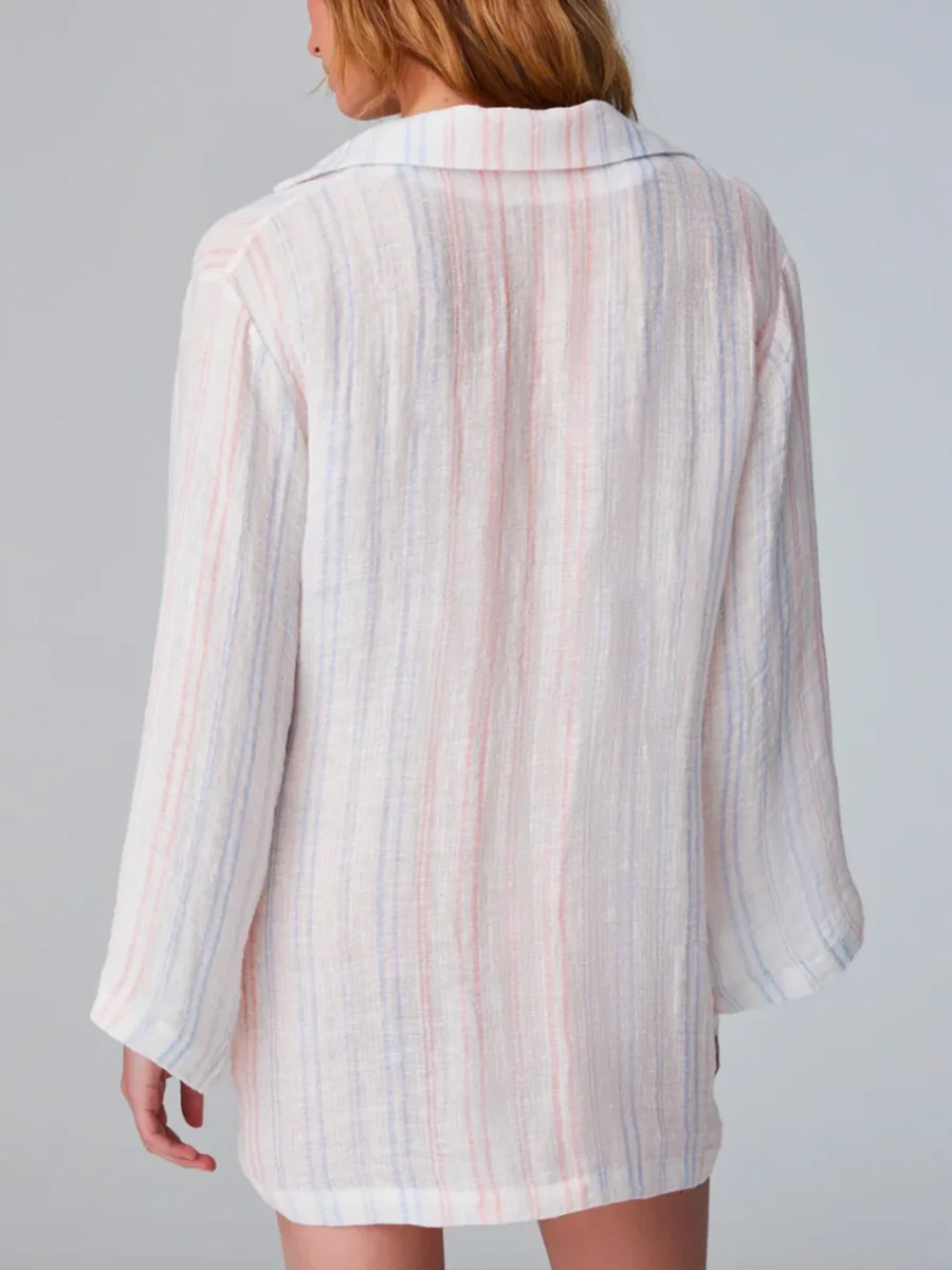 La tunique à rayures rose et bleu de la créatrice Lisa Marie Fernandez est fabriquée aux États-Unis.