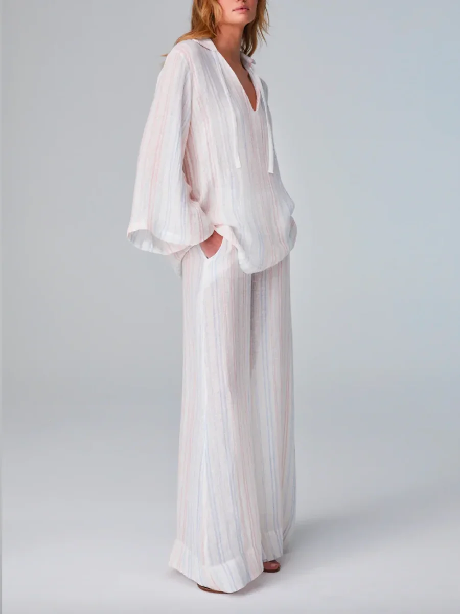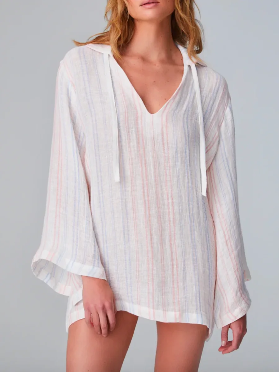 La tunique à rayures rose et bleu de la créatrice Lisa Marie Fernandez est fabriquée aux États-Unis. – Col en V – Manches cloche – Tunique à rayures tons pastel multi Toutes les pièces sont fabriquées aux États-Unis.