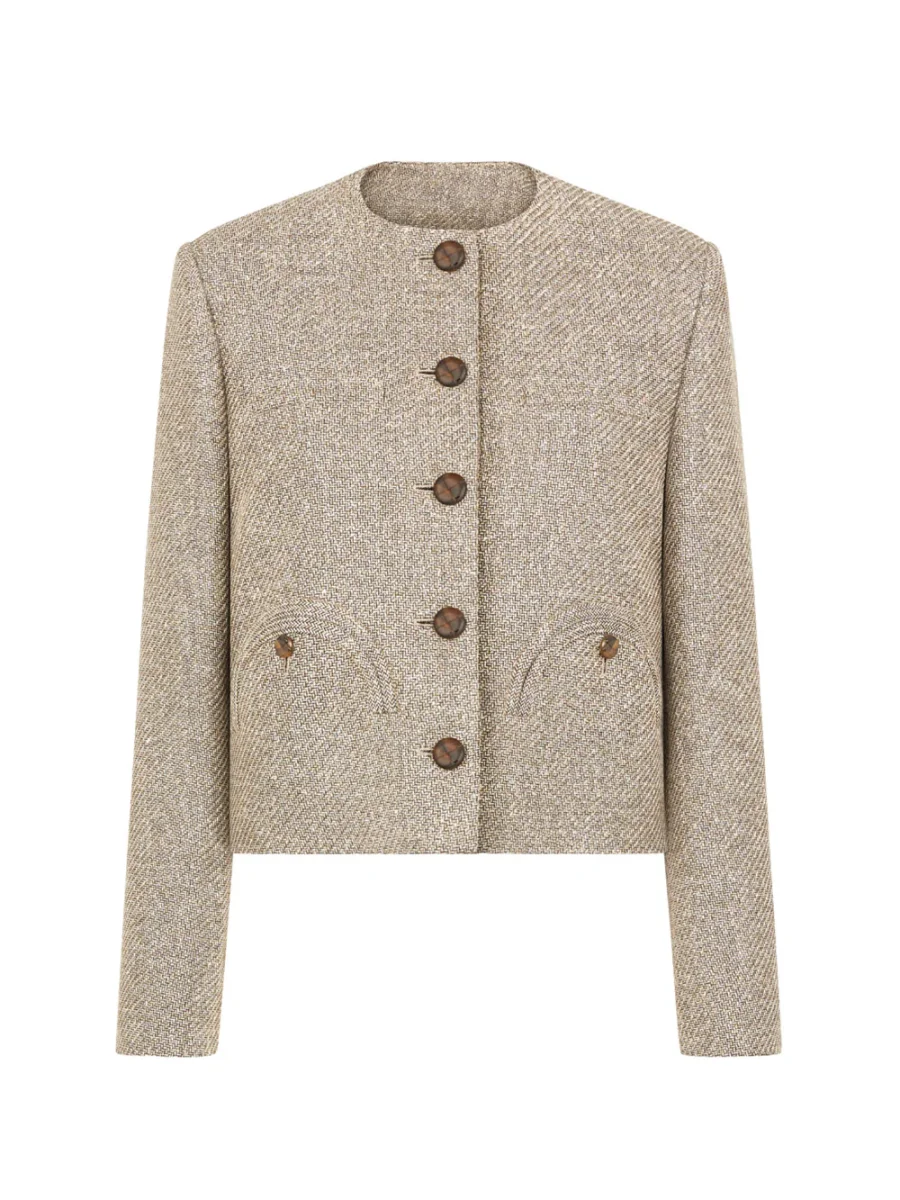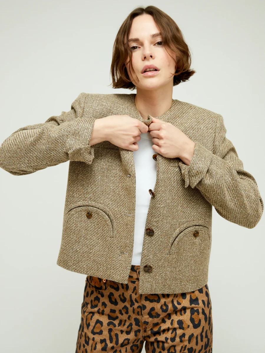 Veste Boléro Saratoga Shamo signé Blazé Milano confectionné dans un mélange de lin, coton et soie beige. Une veste courte à la coupe droite.