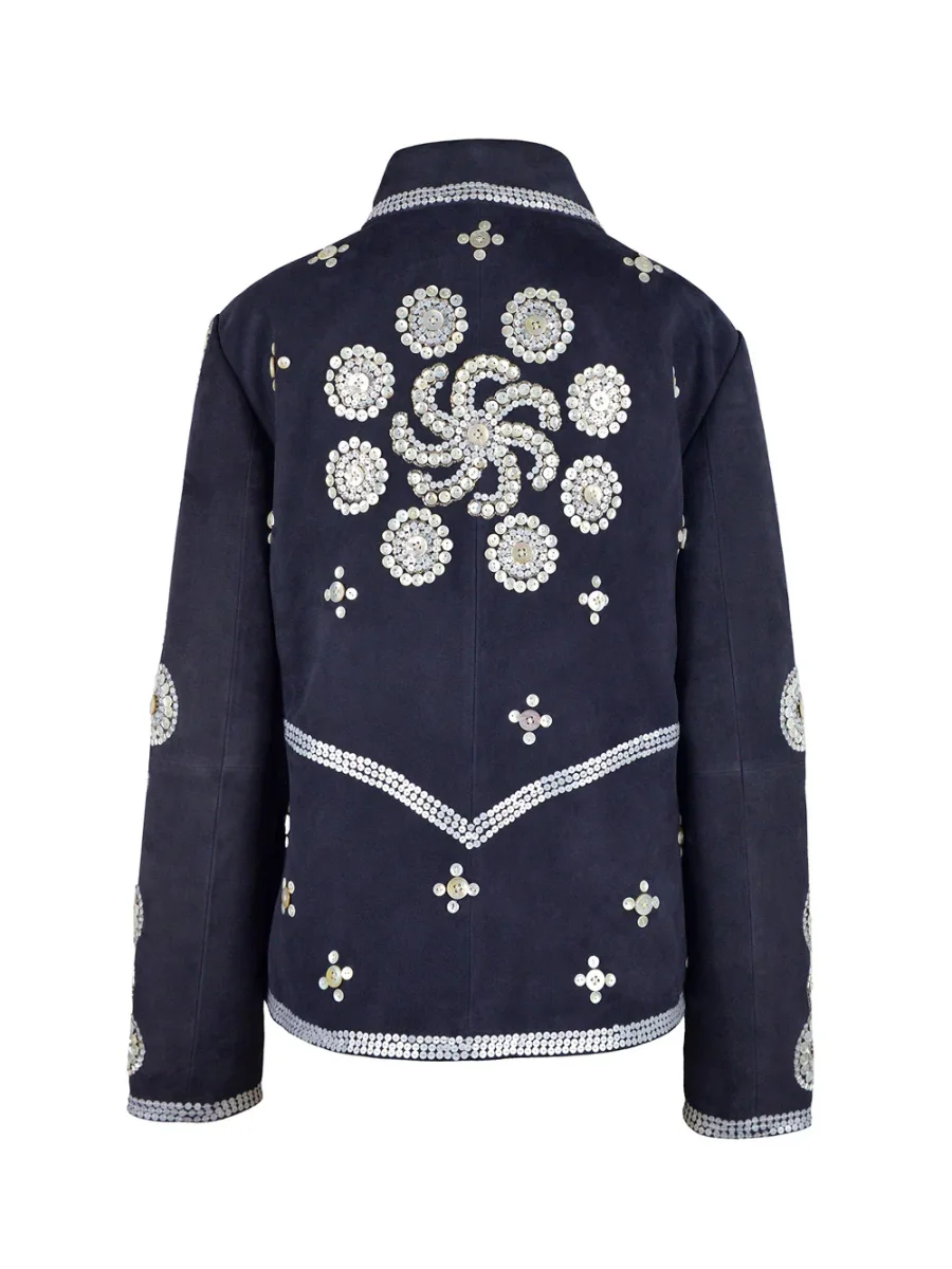 Veste Charro signée Monoki confectionnée en cuir suédé bleu marine entièrement décoré de boutons en nacre formant des motifs fleuris et géométriques. Une pièce forte et originale.