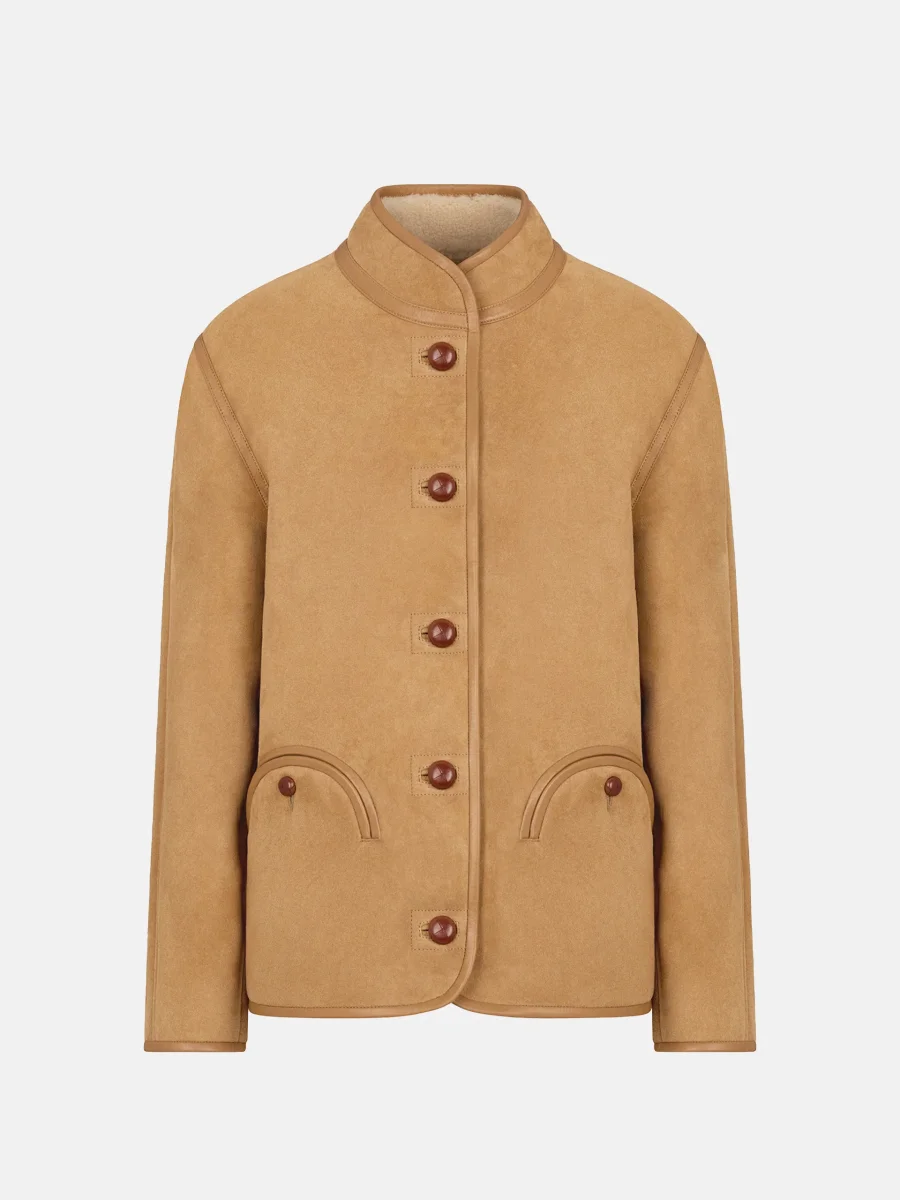 Veste Tatoosh Curly signée Blazé Milano confectionnée en peau d’agneau retournée de couleur camel. Une veste au col mandarin fermée par boutons marron sur le devant.