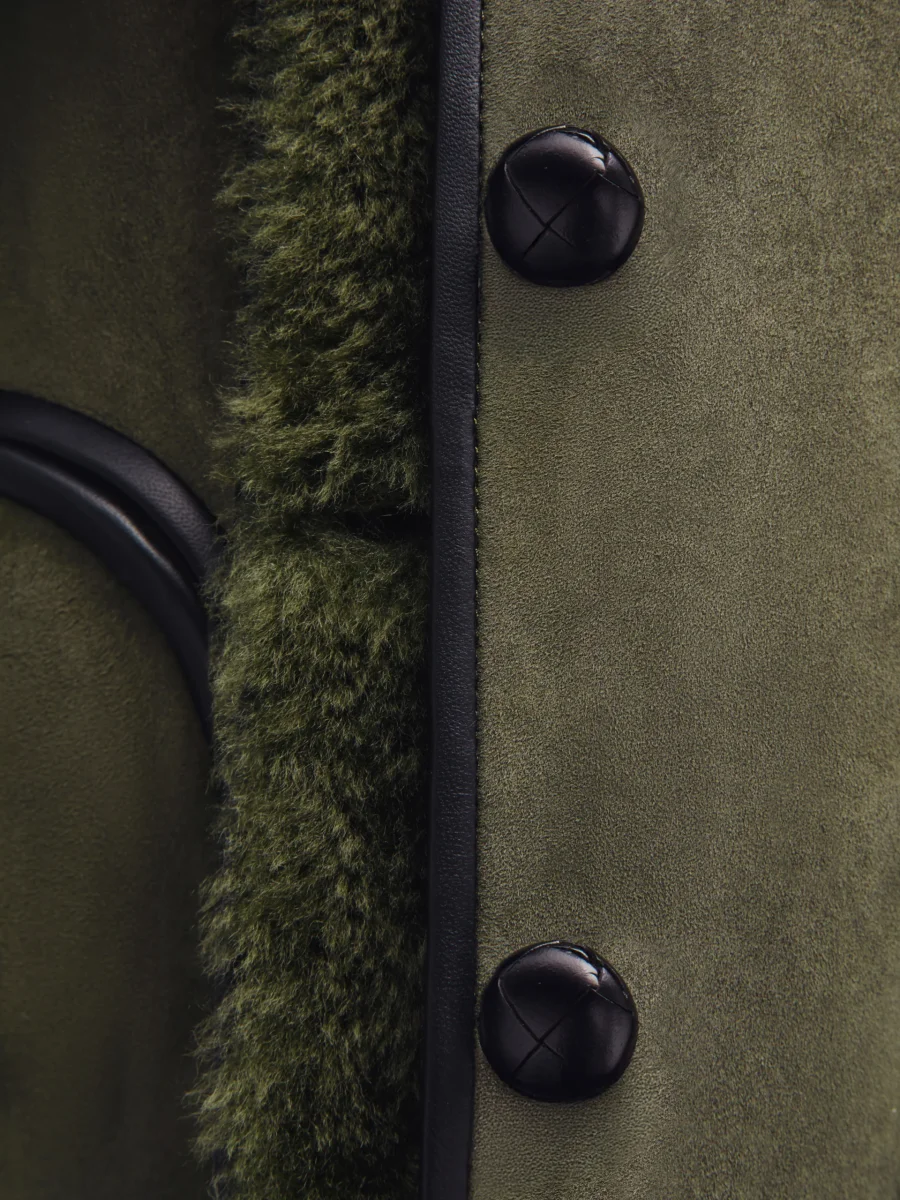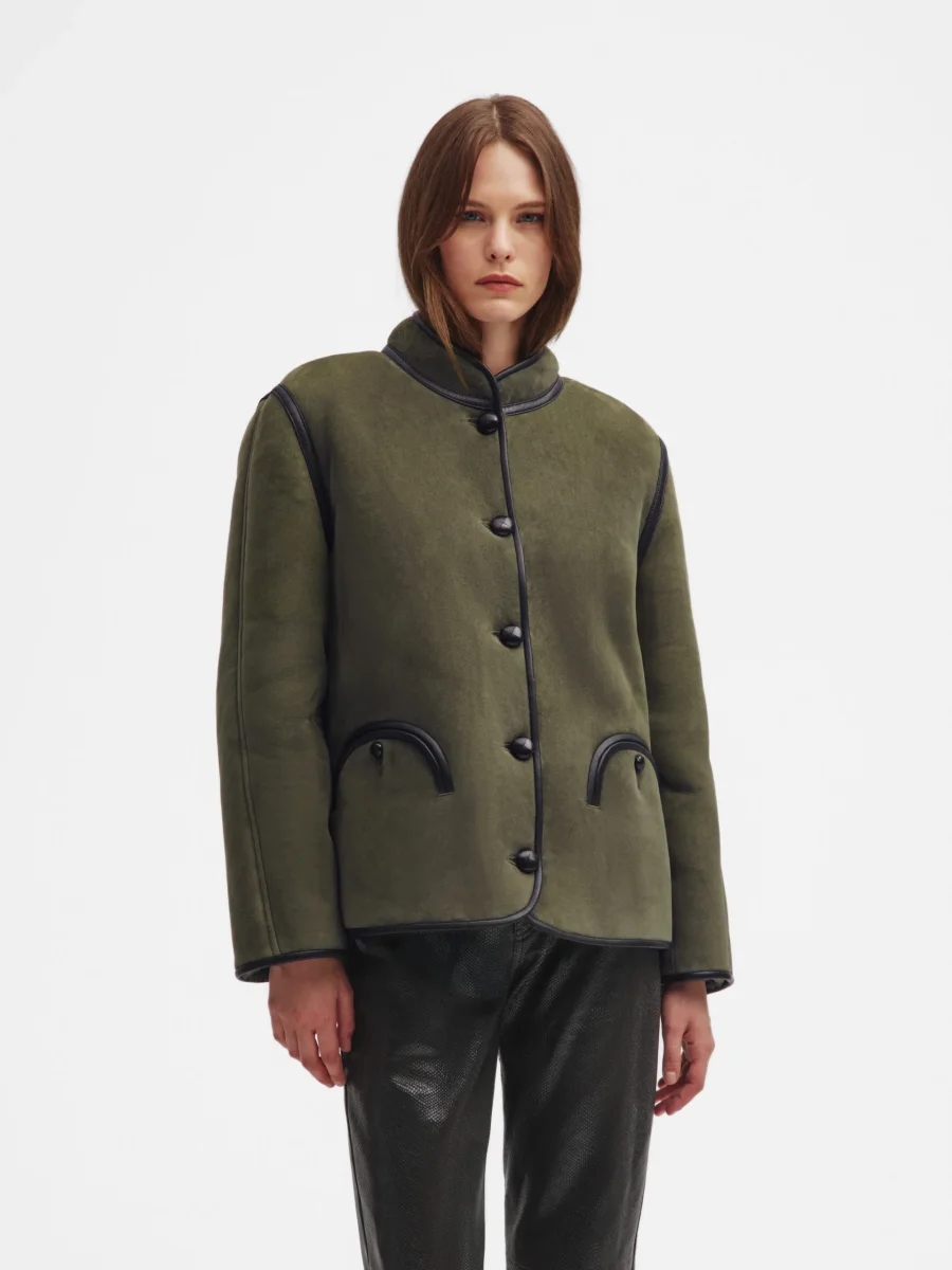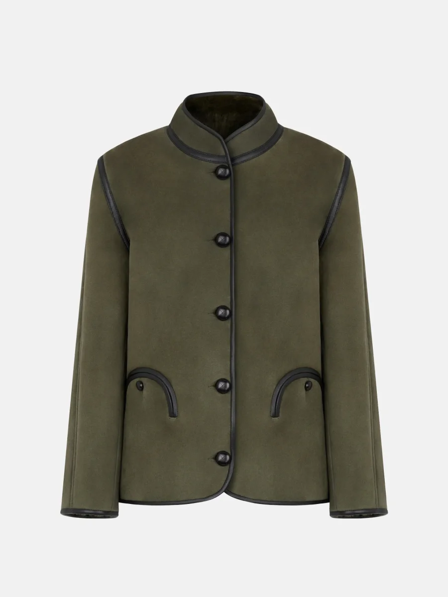 Veste Curly Tatoosh Cardamone signée Blazé Milano confectionnée en peau d’agneau retournée de couleur vert. Une veste au col mandarin fermée par boutons marron sur le devant.