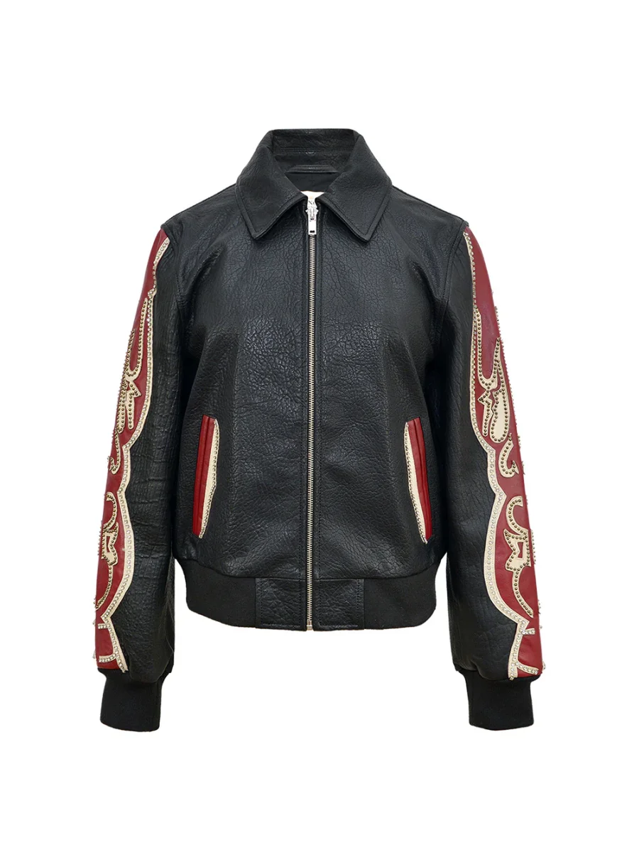 Veste Dallas signée Monoki confectionnée en cuir grainé accompagné de pans en cuir bordeaux et blanc. Une veste à la coupe légèrement bombé, décorée de clous et de crystals au niveau des manches et des poches pour un style rock n’ roll.