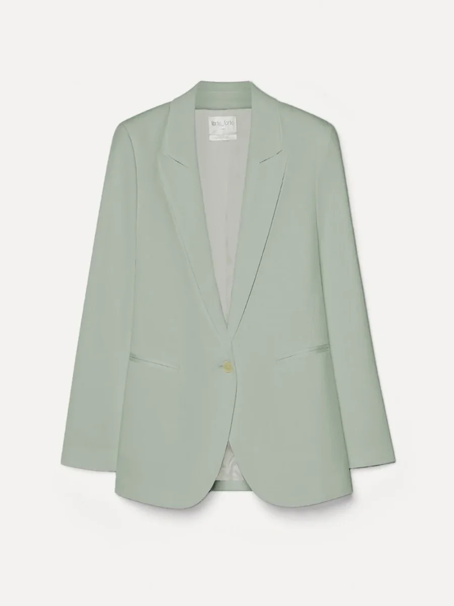 Veste Smoking signée Forte_Forte confectionnée dans un tissu satiné brillant vert d’eau. Une veste de smoking à la coupe droite et simple boutonnage. Un must-have de la garde-robe.