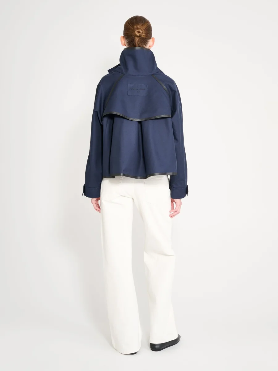 Veste Fisherman Marine signée Nackiyé. Une veste courte en gabardine bleu marine au col se fermant sur le côté grâce à des boutons. L’anorak parfait pour affronter les jours de pluie.