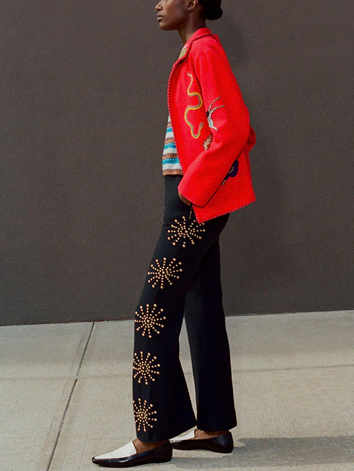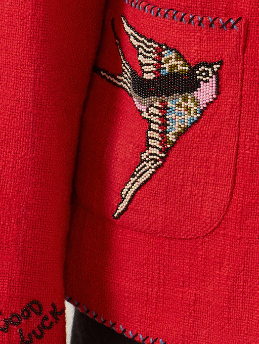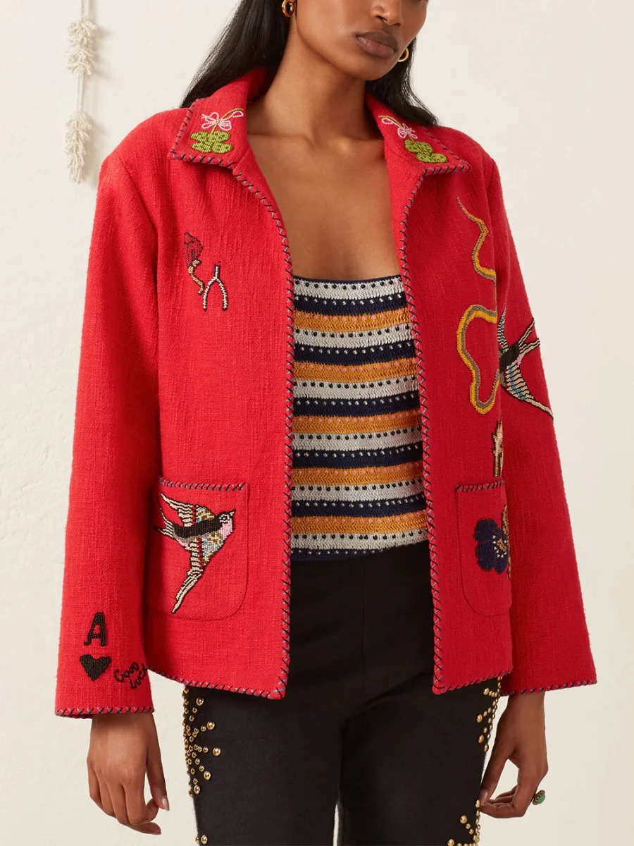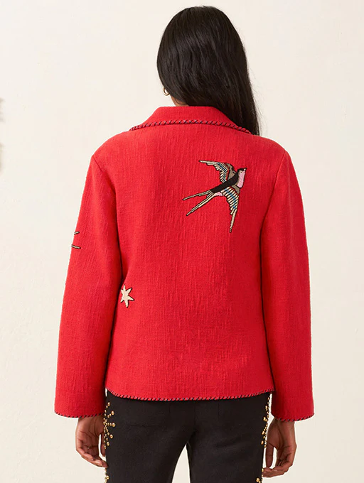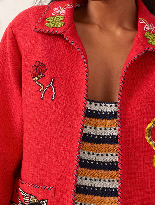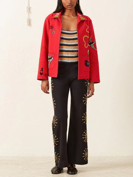 Veste Francis Crimson Tattoo signée Alix of Bohemia confectionnée en coton rouge brodé de motifs divers. Une coupe droite et ajustée, avec un col classique et deux poches plaquées sur le devant.