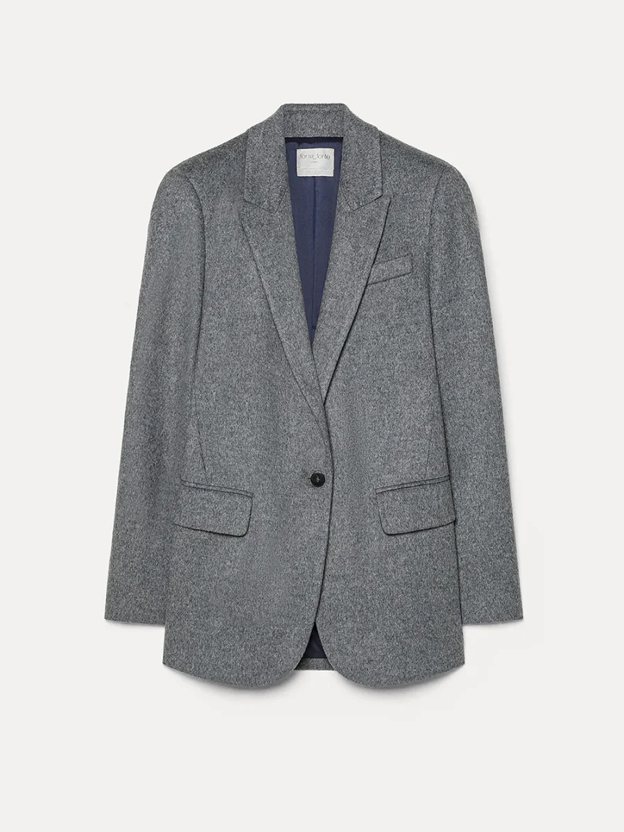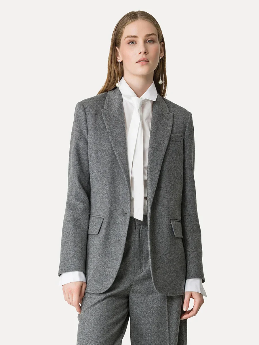 Veste Masculine Gigrio Melange signée Forte_Forte confectionnée en laine gris chiné. Une coupe large masculine à col pointu et simple boutonnage.