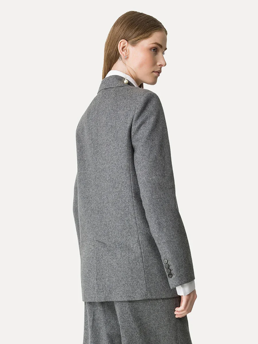 Veste Masculine Gigrio Melange signée Forte_Forte confectionnée en laine gris chiné. Une coupe large masculine à col pointu et simple boutonnage. – Fabriqué en Italie