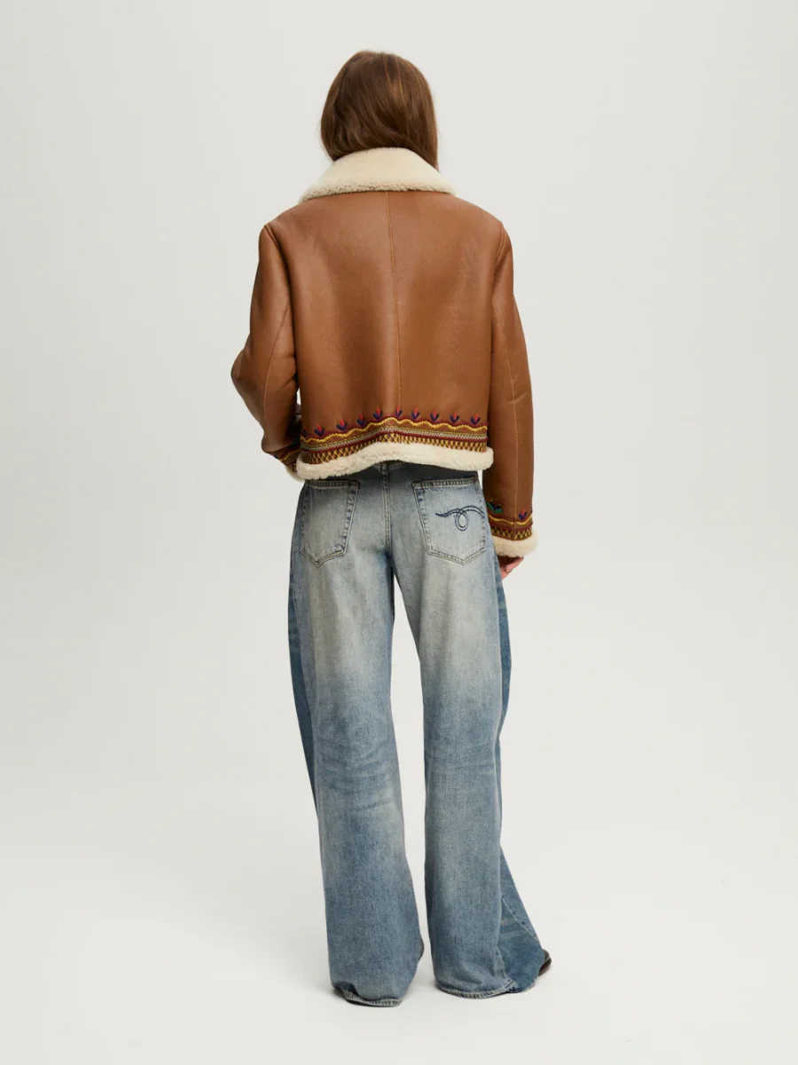 Veste Maverick Navy signée Monoki confectionnée en peau retournée de couleur marron. Une veste courte aux merveilleuses broderies multicolores. Une pièce sublime tout en détail.