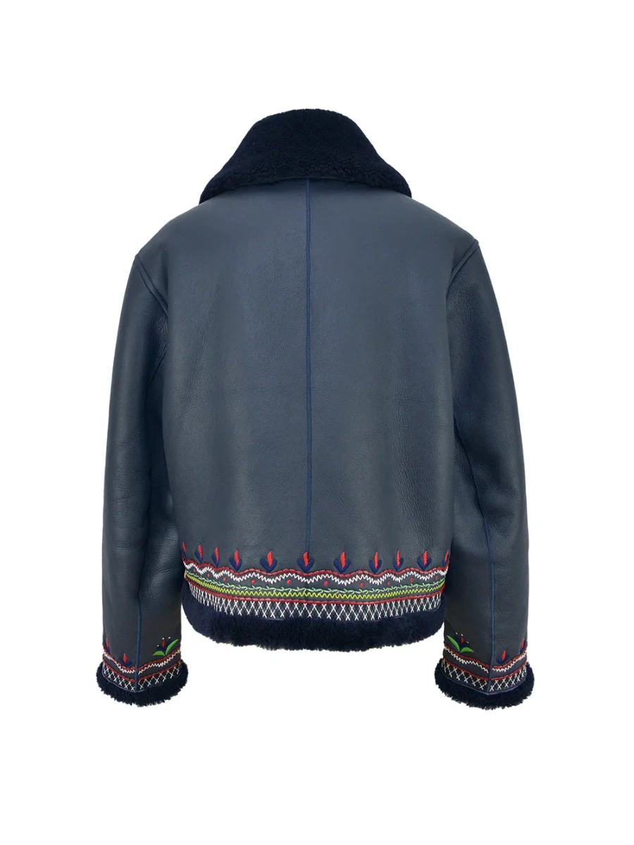 Veste Maverick Navy signée Monoki confectionnée en peau retournée de couleur bleu marine. Une veste courte aux merveilleuses broderies multicolores. Une pièce sublime tout en détail.