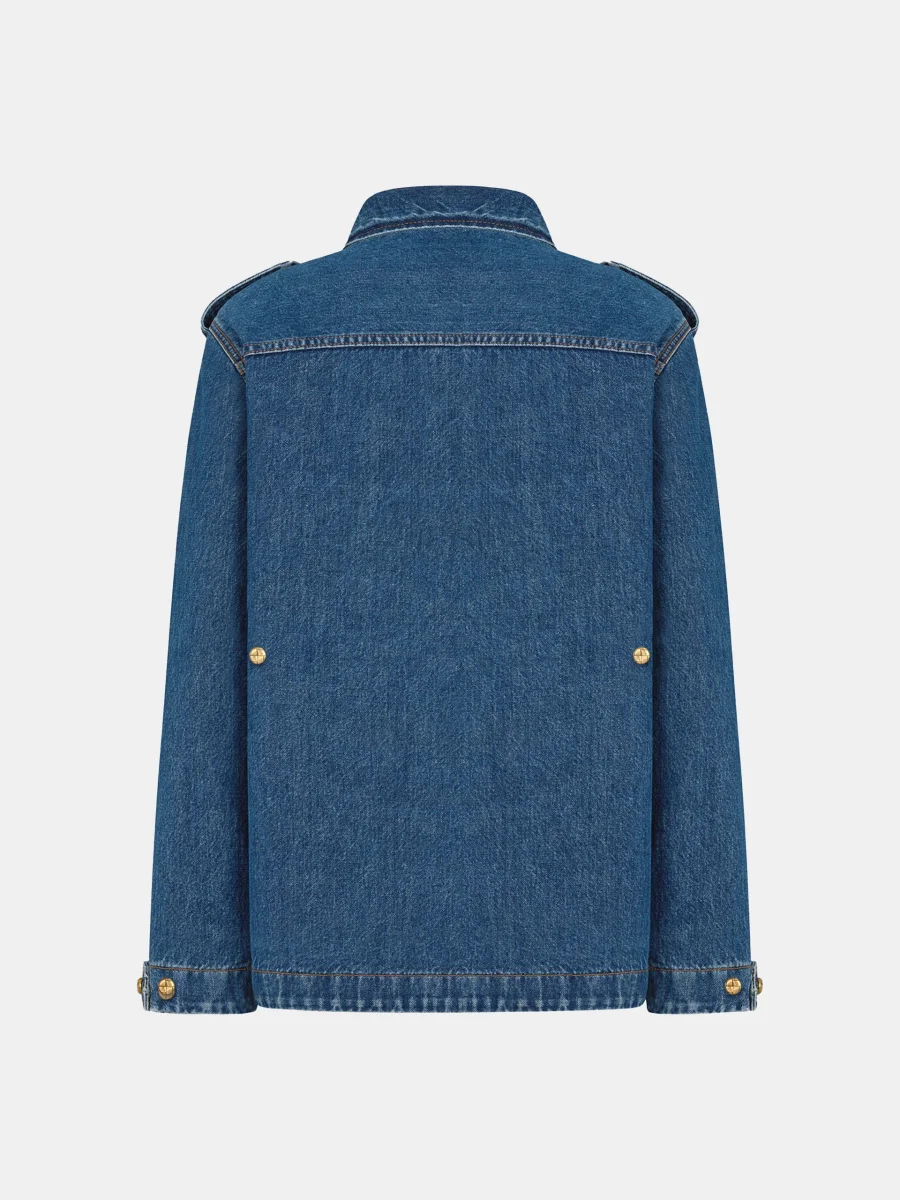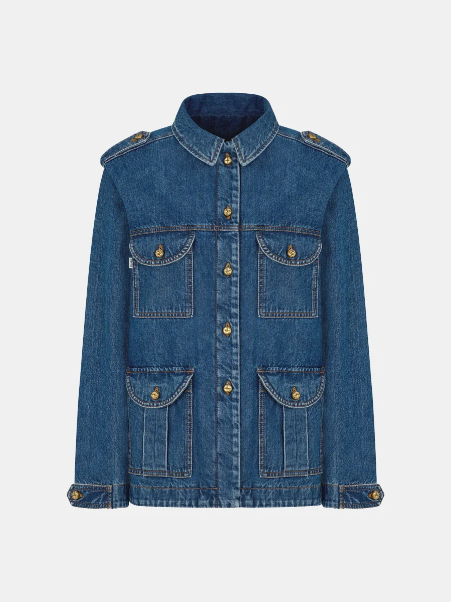 Veste Sahariana Nariida Sapphire signée Blazé Milano confectionnée en denim bleu foncé. Une veste saharienne aux poches plaquées sur le devant. – Fabriquée en Italie – Boutons dorés à la forme tresée