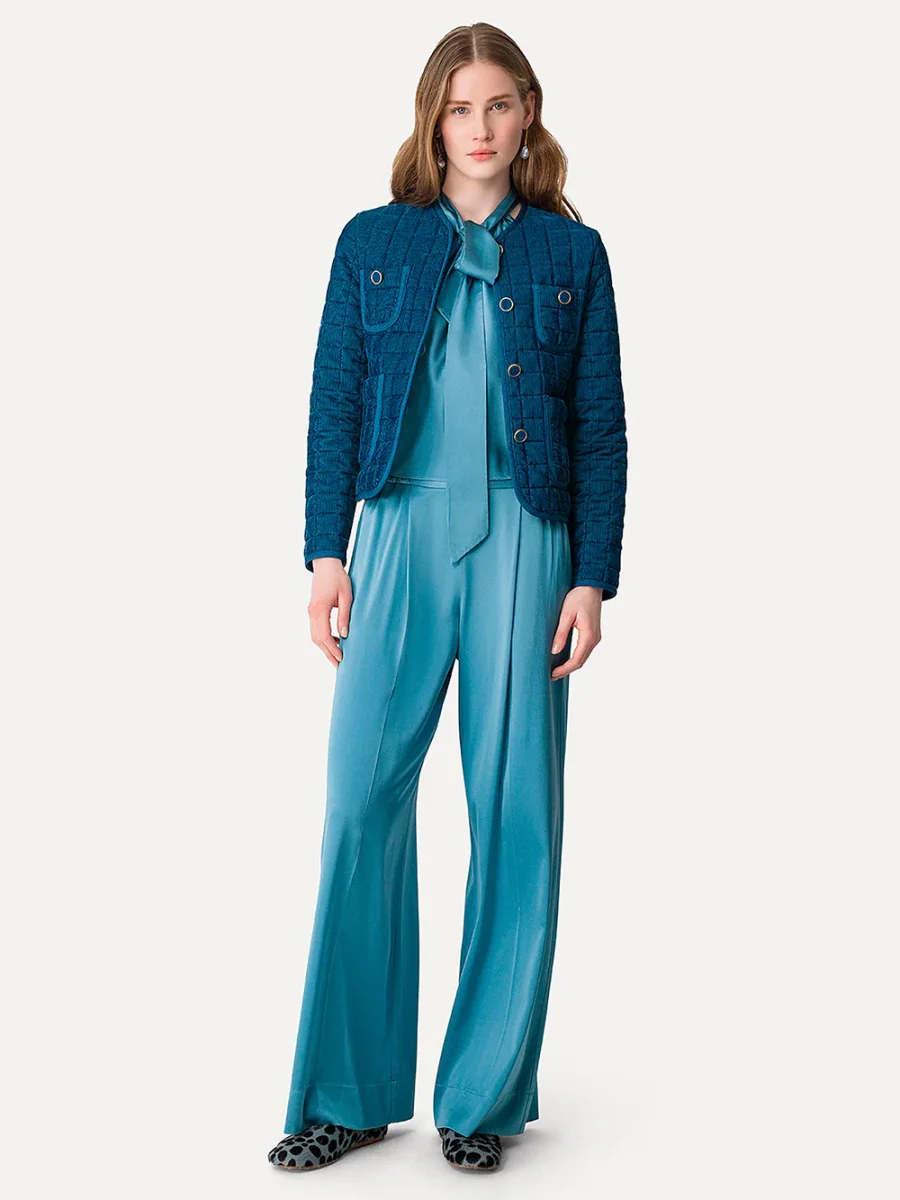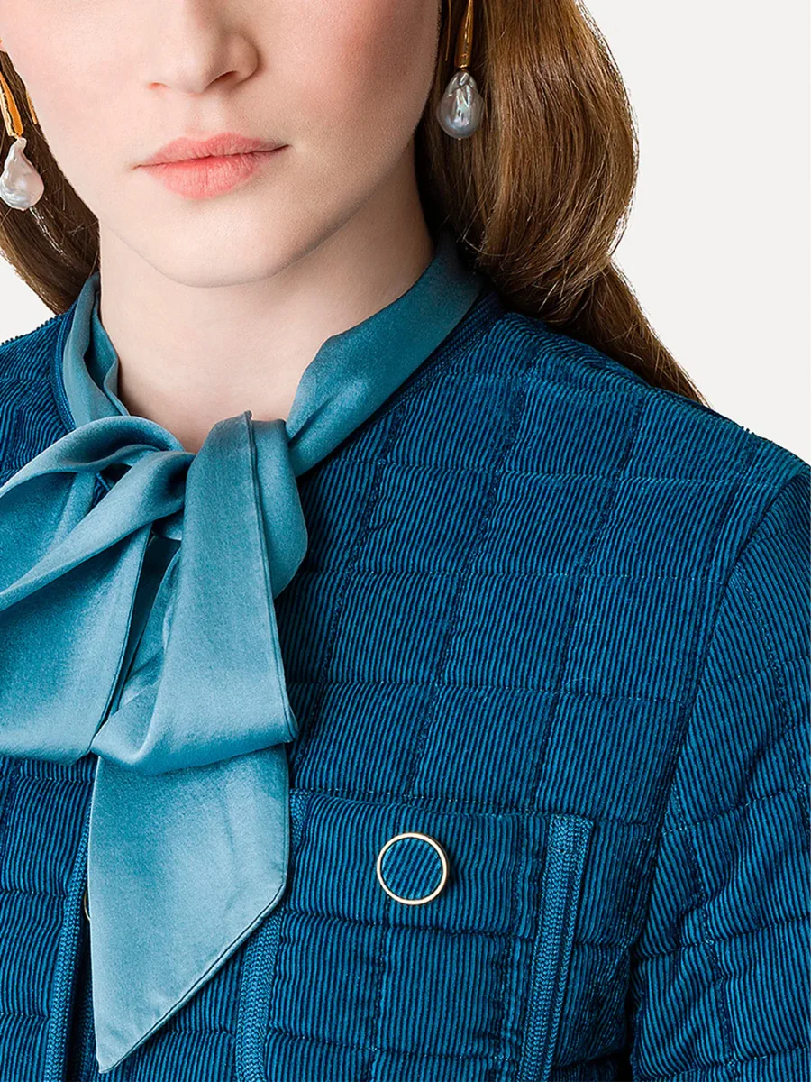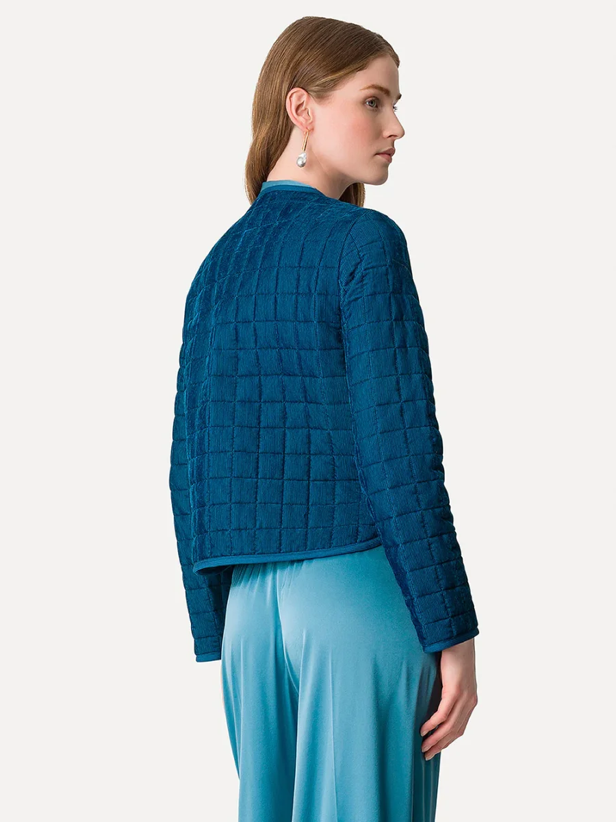 Veste Velours Matelassée signée Forte_Forte confectionnée dans un tissu en velours strié de couleurs pétrole foncé. Une veste courte aux inspirations vintage. – Fabriquée en Italie – Poches plaquées sur le devant
