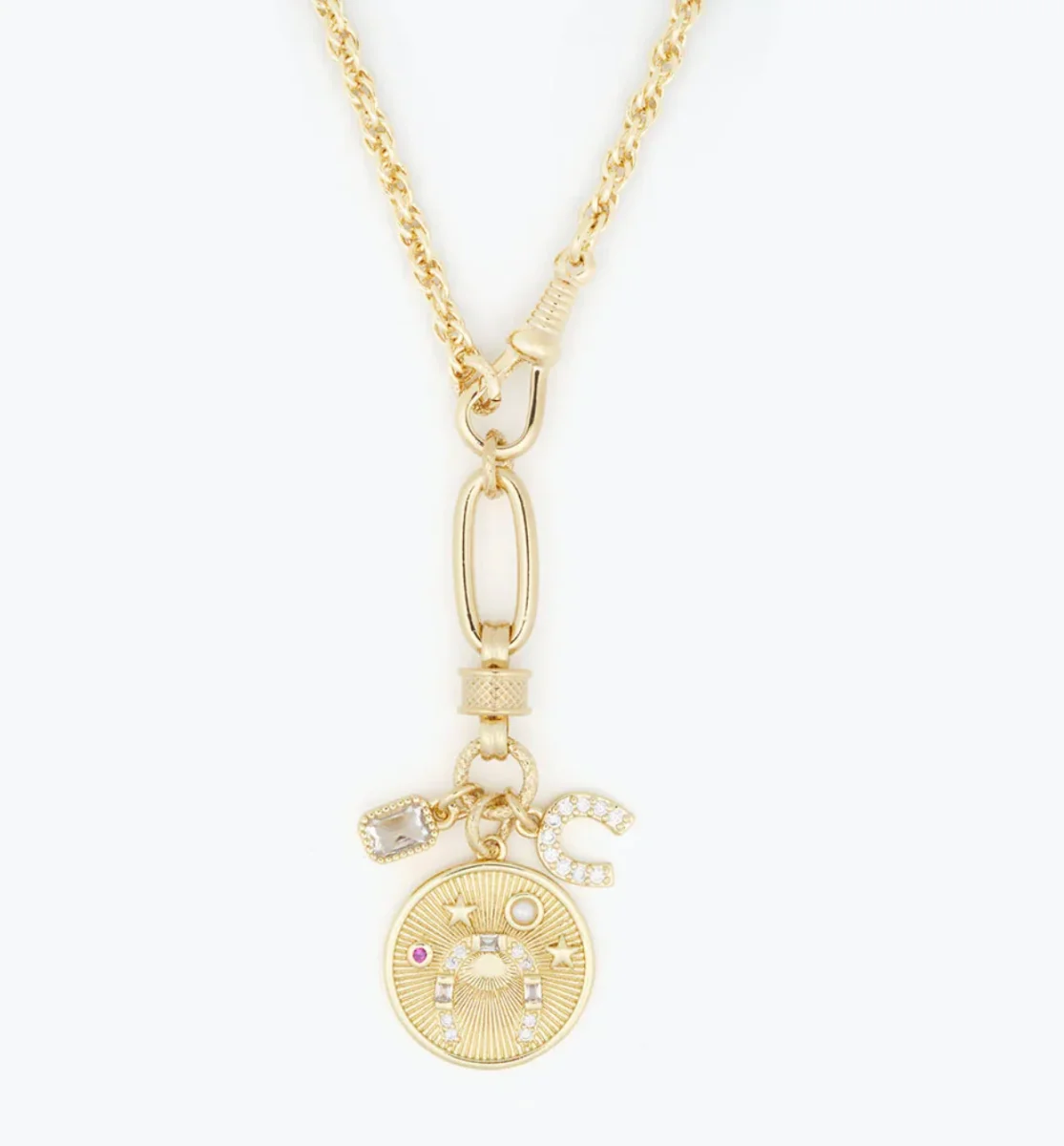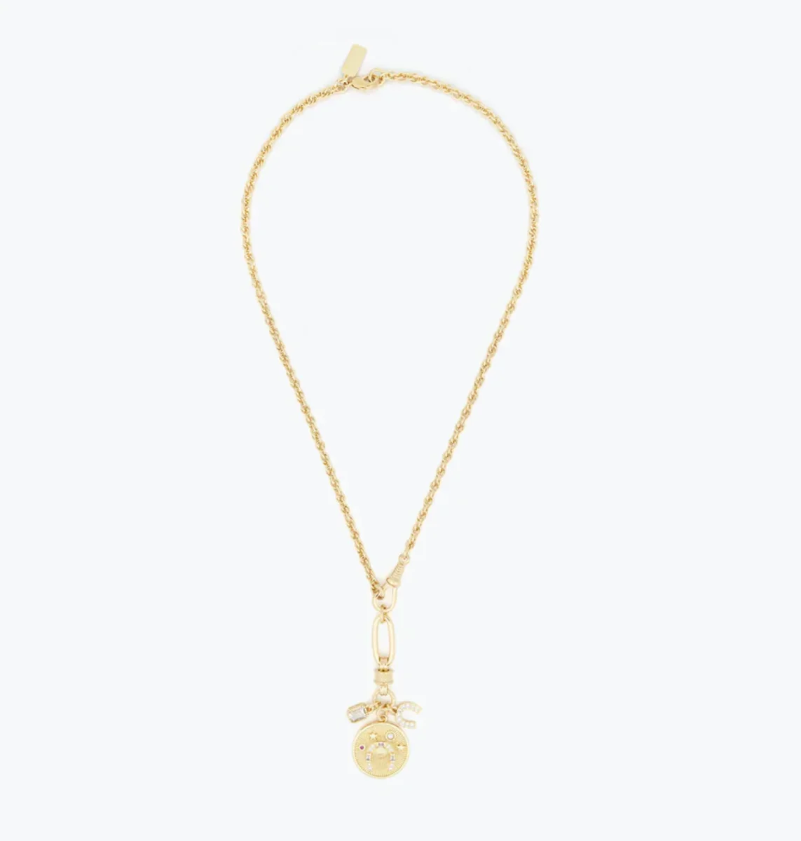 Sublimez votre style avec ce collier doré raffiné, parfait pour apporter une touche d’éclat à toutes vos tenues. Sa chaîne à maillons délicatement torsadés met en valeur un pendentif orné d’un médaillon circulaire et de charmes scintillants, alliant finesse et modernité.