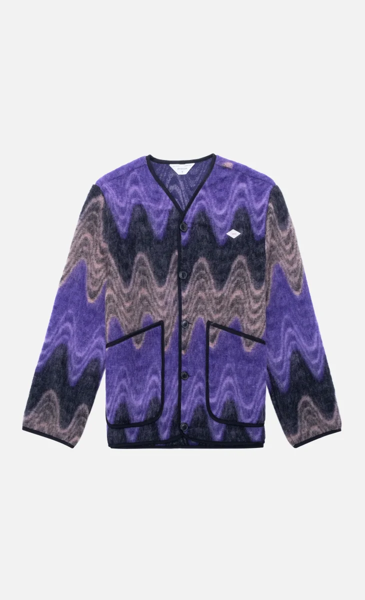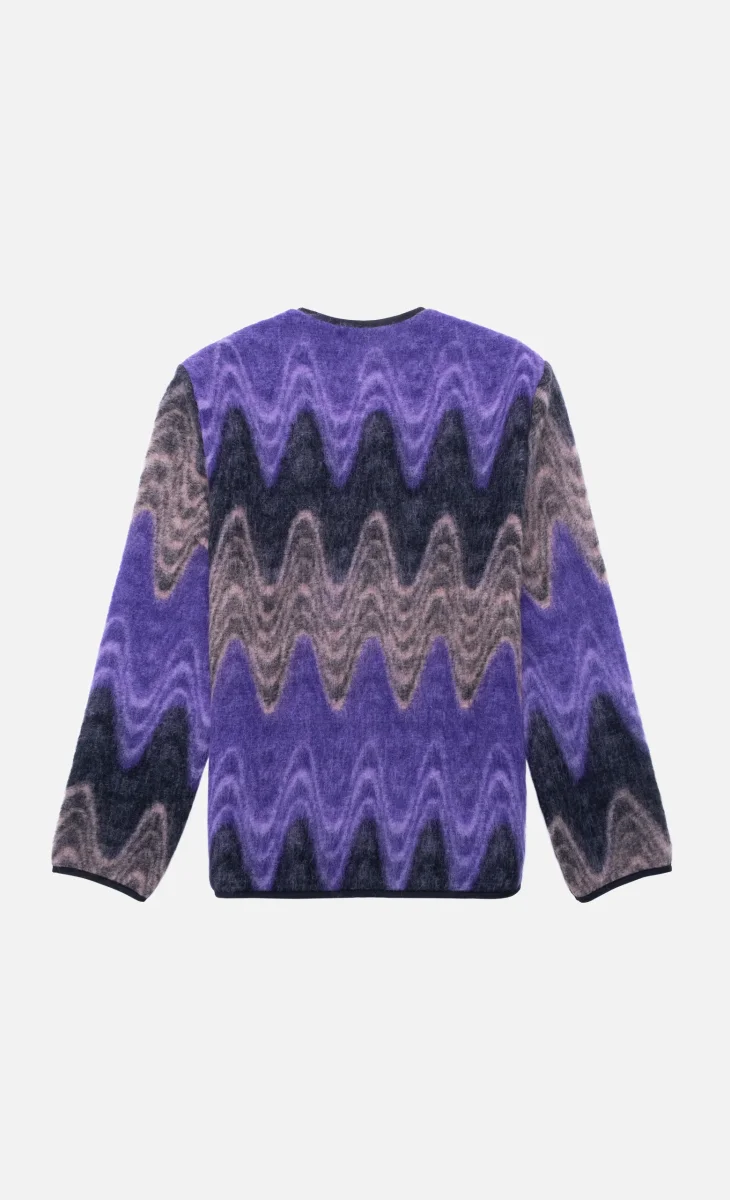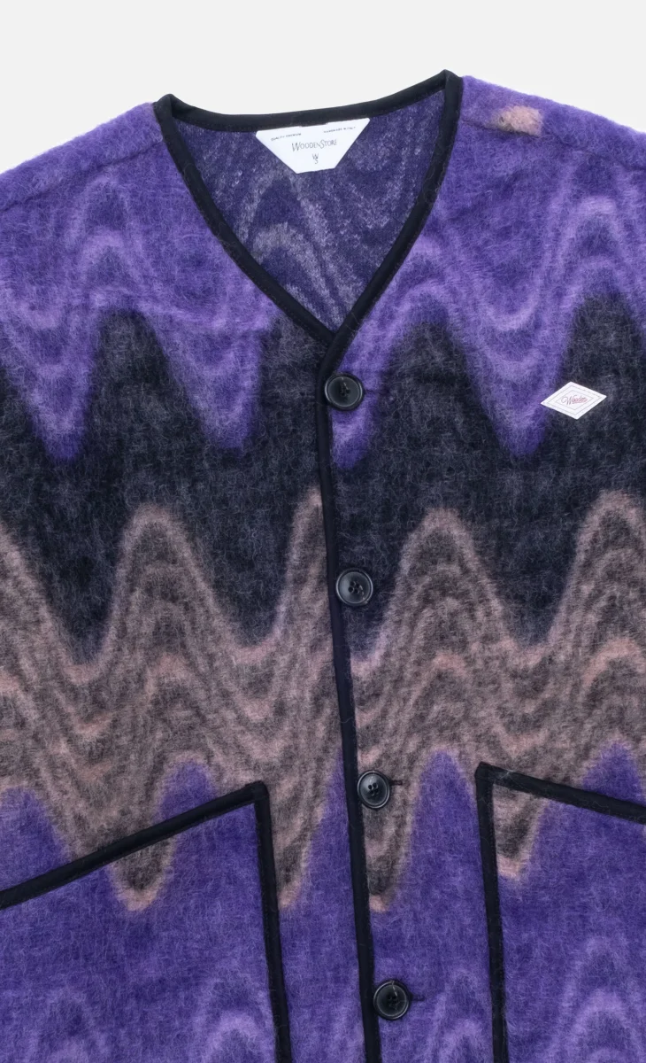 Cette veste en laine Wooden Store présente une coupe ample avec un col V et des manches longues dans un élégant mélange de violet, gris et noir. Elle dispose de poches plaquées à l’avant et d’une fermeture boutonnée, offrant un style moderne et confortable.